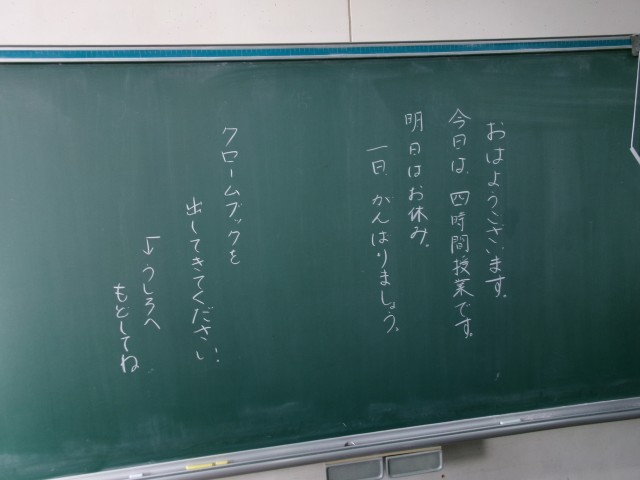 今朝の黒板のメッセージの一部です。「おもてなしの心!」という記載がありました。11日(2限・3限)と12日(2限・3限)には学校公開授業が計画されています。子どもたちは保護者の皆様に「自分が頑張っていること」を見てほしいと思っています。多くの保護者の皆様の来校をお待ちしています。※3枚目写真の「+」をクリックすると、それ以外のコメントも見ることができます。