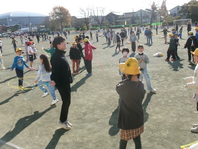 日差しはなく、冷たい風が吹いていますが、多くの子が運動場でなわとびをしています。また、子どもと一緒になわとびしたり、子どもたちの様子を見守ったりしている先生方も多くいます。運動場で遊ぶことを楽しみに学校に来ている子もたくさんいます。※3枚目写真の「+」をクリックするとそれ以外の笑顔が見られます。