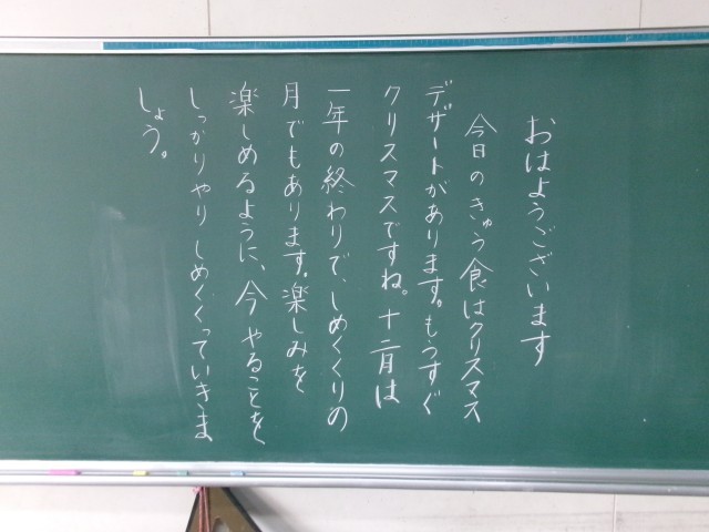 今朝の黒板のメッセージの一部です。「給食はクリスマスデザート!」という記載がありました。担任が子どもたちに気持ちを伝えることで、学級の絆が強くなります。これからも担任の思いや願いをくみ取れる子どもたちであってほしいです。※3枚目写真の「+」をクリックすると、それ以外のコメントも見ることができます。