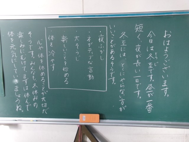 今朝の黒板のメッセージの一部です。「今日は冬至 !」「冬休みまで あと2日!」という記載がありました。担任が子どもたちに気持ちを伝えることで、学級の絆が強くなります。これからも担任の思いや願いをくみ取れる子どもたちであってほしいです。※3枚目写真の「+」をクリックすると、それ以外のコメントも見ることができます。
