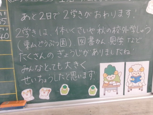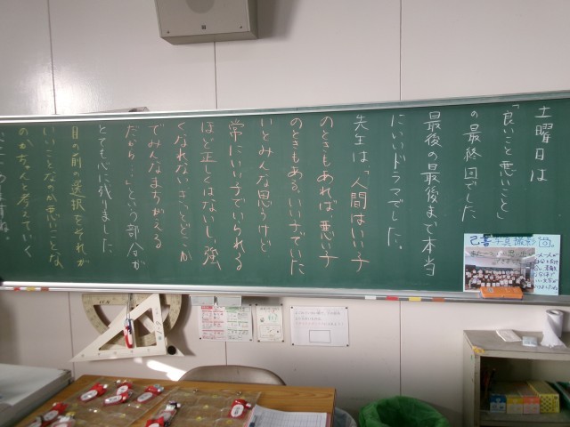 今朝の黒板のメッセージの一部です。「良い終わりは、良い始まり!」という記載がありました。担任が子どもたちに気持ちを伝えることで、学級の絆が強くなります。これからも担任の思いや願いをくみ取れる子どもたちであってほしいです。※3枚目写真の「+」をクリックすると、それ以外のコメントも見ることができます。