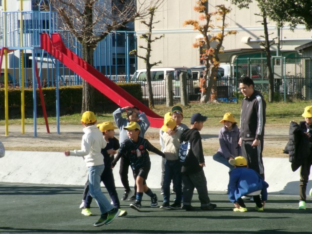 日差しがあって、さほど寒くありません。多くの子が運動場で走り回っています。また、子どもと一緒にバスケットボール、ドッジボール、なわとびなどをしている先生が多くいました。6年生が1年生のなわとびを直している姿もありました。※3枚目写真の「+」をクリックするとそれ以外の笑顔が見られます。