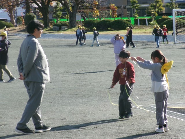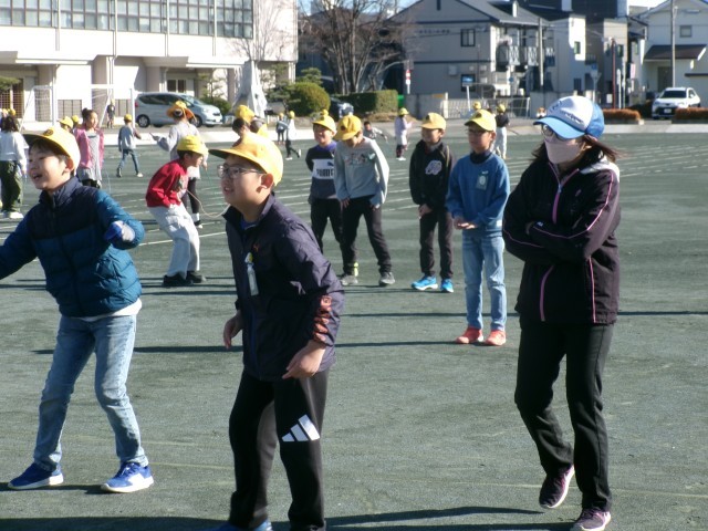 日差しがあって、さほど寒くありません。多くの子が運動場で走り回っています。また、子どもと一緒にタイヤ上ジャンケン、ドッジボール、なわとびなどをしている先生が多くいました。6年生が1年生のなわとびを直している姿もありました。※3枚目写真の「+」をクリックするとそれ以外の笑顔が見られます。