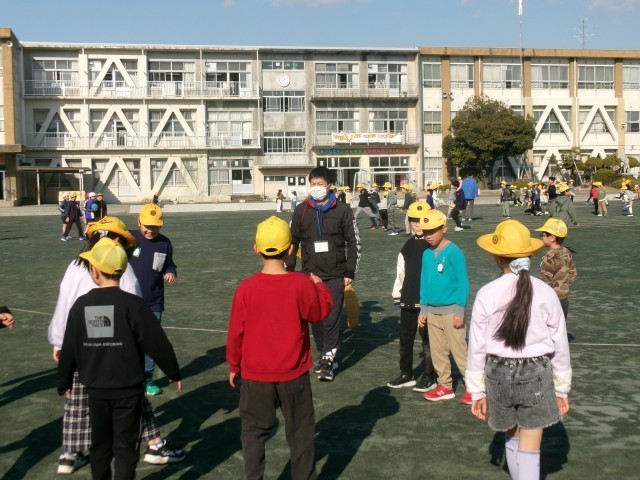 日差しがあって、さほど寒くありません。多くの子が運動場で走り回っています。また、子どもと一緒にタイヤ上ジャンケン、ドッジボール、なわとびなどをしている先生が多くいました。6年生が1年生のなわとびを直している姿もありました。※3枚目写真の「+」をクリックするとそれ以外の笑顔が見られます。
