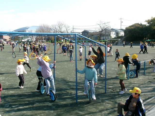 日差しがあって、さほど寒くありません。多くの子が運動場で走り回っています。また、子どもと一緒にバスケットボール、ドッジボール、なわとびなどをしている先生が多くいました。6年生が1年生のなわとびを直している姿もありました。※3枚目写真の「+」をクリックするとそれ以外の笑顔が見られます。