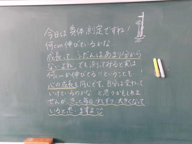 今朝の黒板のメッセージの一部です。「ペアなわとび!」という記載がありました。担任が子どもたちに気持ちを伝えることで、学級の絆が強くなります。これからも担任の思いや願いをくみ取れる子どもたちであってほしいです。※3枚目写真の「+」をクリックすると、それ以外のコメントも見ることができます。