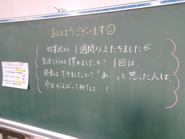 始業式、黒板にメッセージには「あけましておめでとうございます!」「新しい自分を目指す」「卒業に向けて」など担任から子どもたちへの思いが記入されていました。3学期も子どもたちは様々な活動を通して成長していきます。その成長を、子どもたちに実感させることで、学級がまとまり楽しくなります。※3枚目写真の「+」をクリックすると、それ以外のコメントが見られます。