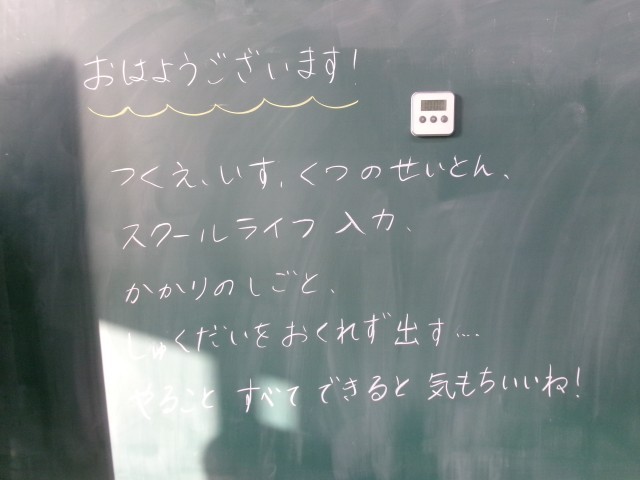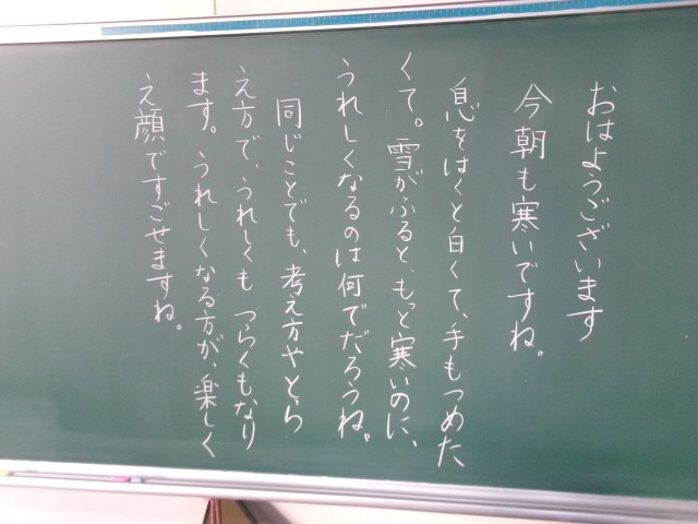 1/9 今朝の黒板「足りないことがあれば、補い合って !」