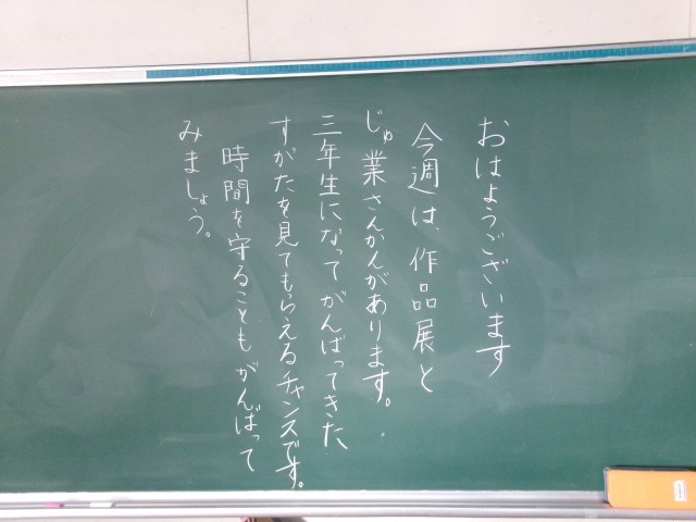 今朝の黒板のメッセージの一部です。「作品展と授業参観!」という記載がありました。担任が子どもたちに気持ちを伝えることで、学級の絆が強くなります。これからも担任の思いや願いをくみ取れる子どもたちであってほしいです。※3枚目写真の「+」をクリックすると、それ以外のコメントも見ることができます。