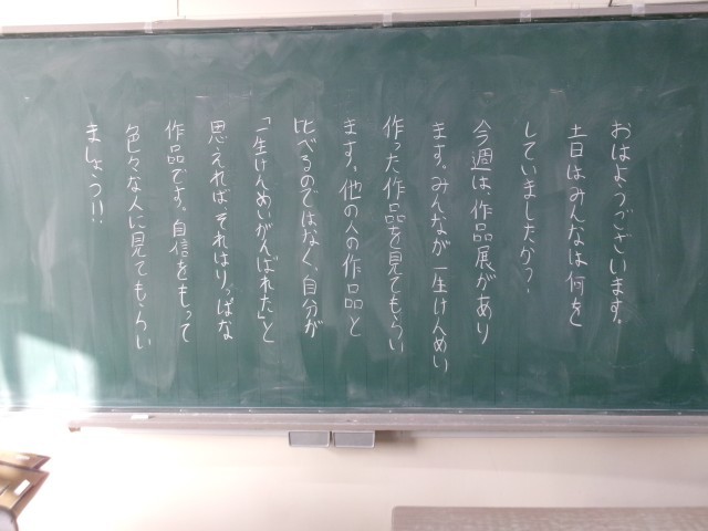 1/19 今朝の黒板「 作品展と授業参観 !」