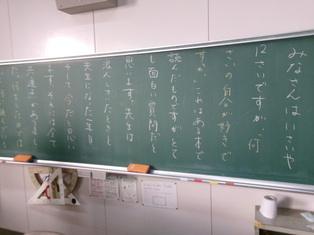 今朝の黒板のメッセージの一部です。「お楽しみ会 !」という記載がありました。担任が子どもたちに気持ちを伝えることで、学級の絆が強くなります。これからも担任の思いや願いをくみ取れる子どもたちであってほしいです。※3枚目写真の「+」をクリックすると、それ以外のコメントも見ることができます。