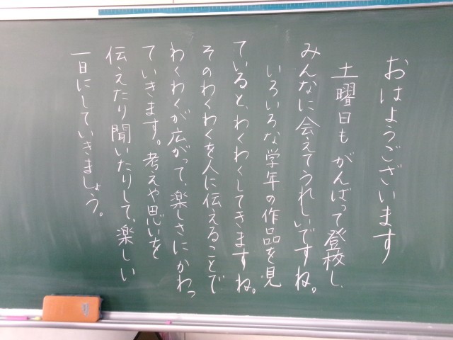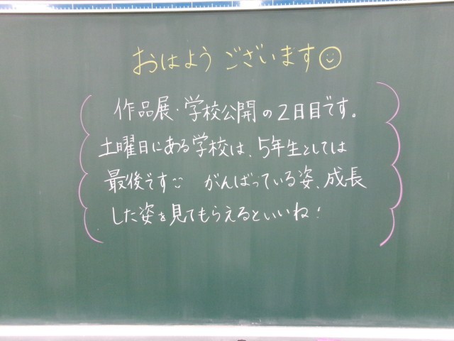 今朝の黒板のメッセージの一部です。「作品展と授業参観!」という記載がありました。担任が子どもたちに気持ちを伝えることで、学級の絆が強くなります。これからも担任の思いや願いをくみ取れる子どもたちであってほしいです。※3枚目写真の「+」をクリックすると、それ以外のコメントも見ることができます。