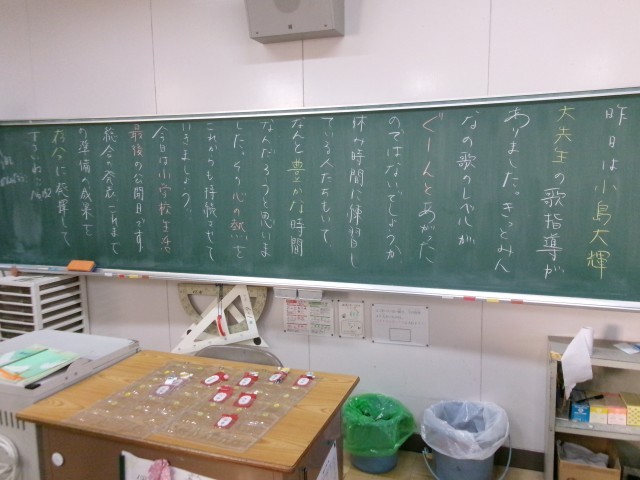 今朝の黒板のメッセージの一部です。「やさしい行動をたくさん見ました!」という記載がありました。担任が子どもたちに気持ちを伝えることで、学級の絆が強くなります。これからも担任の思いや願いをくみ取れる子どもたちであってほしいです。※3枚目写真の「+」をクリックすると、それ以外のコメントも見ることができます。