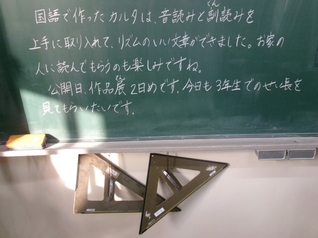 1/19 今朝の黒板「 作品展と授業参観 !」