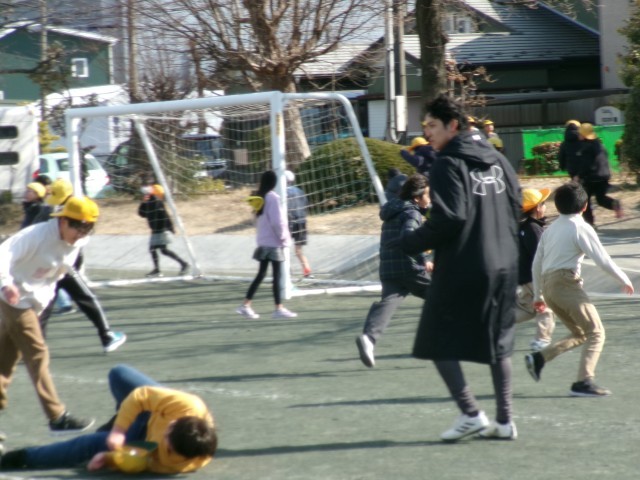 日差しがあり、先週よりは随分暖かく感じます。多くの子が運動場で走り回っています。また、お兄さんと一緒にドッジボールをしている子どもたちを見守っている先生がいました。また、にがりが解けていない箇所に入らないように注意している先生の姿もありました。※3枚目写真の「+」をクリックするとそれ以外の笑顔が見られます。