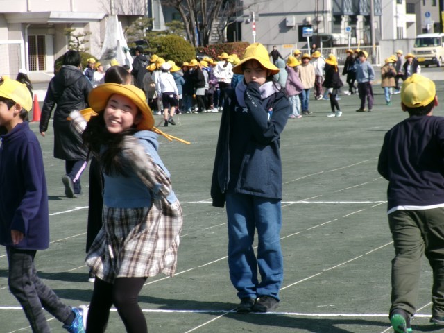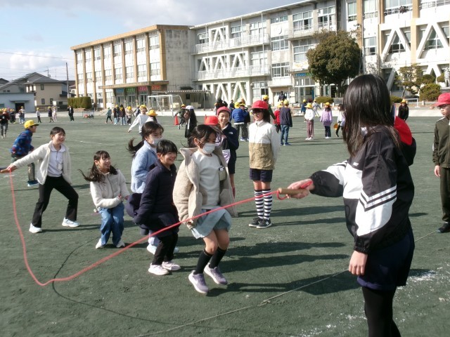 日差しがなく非常に冷たい風が吹いていますが、多くの子が運動場で走り回っています。また、子どもと一緒になわとびやドッジボールをしている先生が多くいました。6年生が小さな子と遊んでいる姿もありました。※3枚目写真の「+」をクリックするとそれ以外の笑顔が見られます。