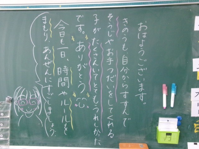 今朝の黒板のメッセージの一部です。「なかよし遊び!」という記載がありました。担任が子どもたちに気持ちを伝えることで、学級の絆が強くなります。これからも担任の思いや願いをくみ取れる子どもたちであってほしいです。※3枚目写真の「+」をクリックすると、それ以外のコメントも見ることができます。