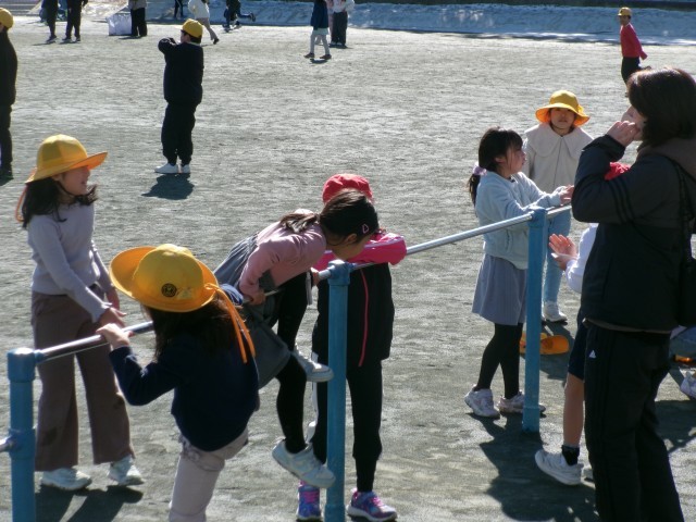 日差しがあり、先週よりは随分暖かく感じます。多くの子が運動場で走り回っています。また、お兄さんと一緒にドッジボールをしている子どもたちを見守っている先生がいました。また、にがりが解けていない箇所に入らないように注意している先生の姿もありました。※3枚目写真の「+」をクリックするとそれ以外の笑顔が見られます。