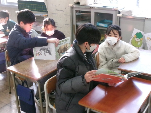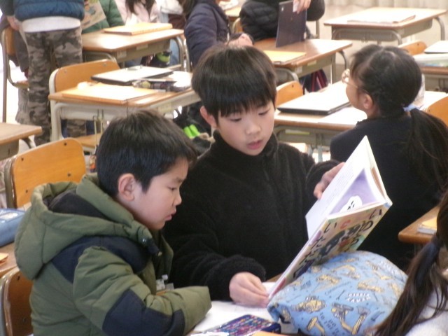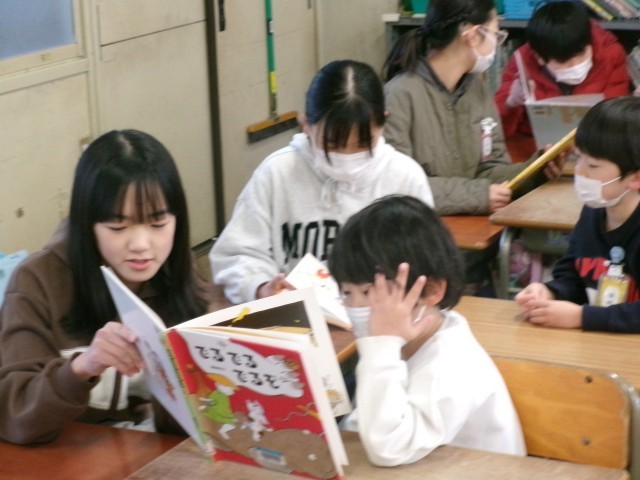 今日は、なかよし読書がありました。「6年生が1年生」「5年生が3年生」「4年生が2年生」のペアの子に向けてお兄さん・お姉さんが読み聞かせをしました。ペアの子に寄り添いながら一人一人頑張ることができました。小さな子もも真剣な表情で聞いていました。※3枚目写真の「+」をクリックすると、そ以外の笑顔を見ることができます。 -