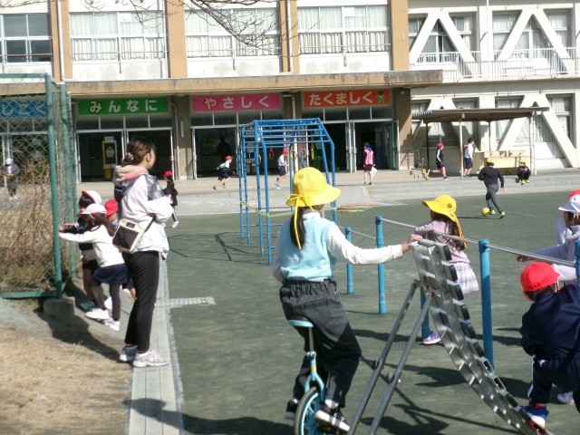 日差しがあり、先週よりは随分暖かく感じます。多くの子が運動場で走り回っています。また、お兄さんと一緒にドッジボールをしている子どもたちを見守っている先生がいました。また、にがりが解けていない箇所に入らないように注意している先生の姿もありました。※3枚目写真の「+」をクリックするとそれ以外の笑顔が見られます。