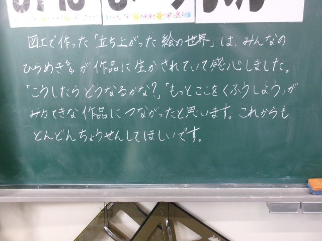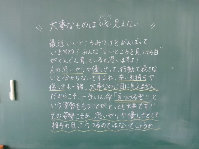 今朝の黒板のメッセージの一部です。「見守ることも 優しさ! 」という記載がありました。担任が子どもたちに気持ちを伝えることで、学級の絆が強くなります。これからも担任の思いや願いをくみ取れる子どもたちであってほしいです。※3枚目写真の「+」をクリックすると、それ以外のコメントも見ることができます。