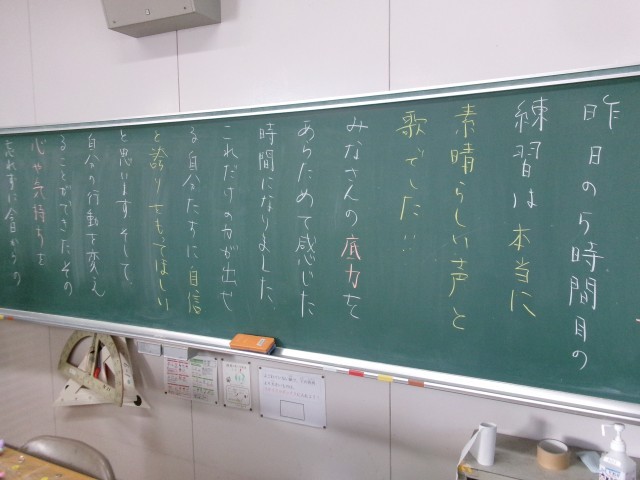 今朝の黒板のメッセージの一部です。「一日 一日を大切に! 」という記載がありました。担任が子どもたちに気持ちを伝えることで、学級の絆が強くなります。これからも担任の思いや願いをくみ取れる子どもたちであってほしいです。※3枚目写真の「+」をクリックすると、それ以外のコメントも見ることができます。