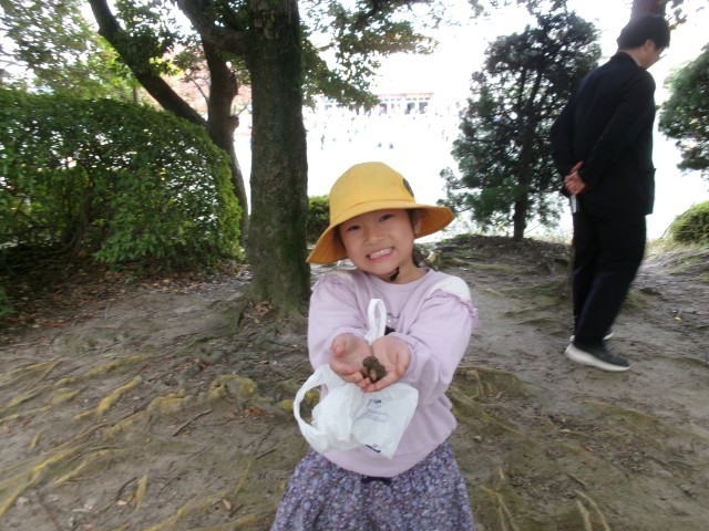 今日の放課「かみやまのもり」のようすです。やまの頂上・記念碑の前にも多くの子どもたちが集まっていました。ドングリがたくさん落ちているので、集めたどんぐりを見せてくれる子がいました。保護者の方も一緒に森の中を散策していました。!※3枚目写真の「+」をクリックするとその他の笑顔が見られます。