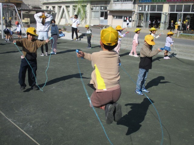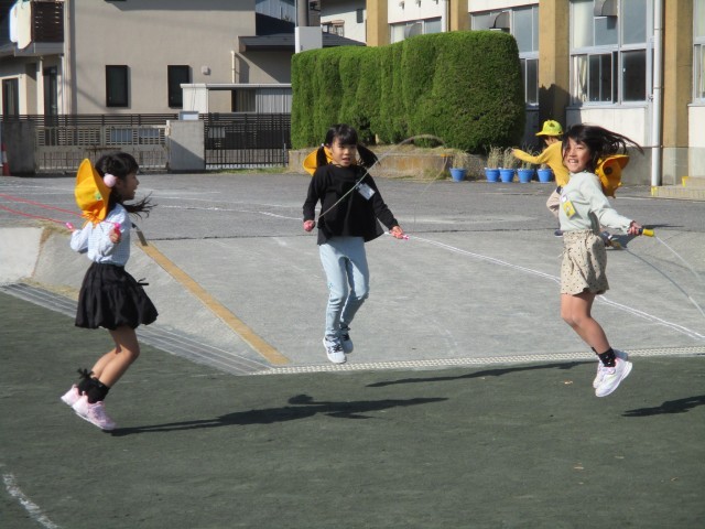 なわとびを楽しむ子が増えてきています。みんなで一緒に跳び始めてみたり、交代で回数をかぞえたり、ぴょんぴょん跳んでいます。学年が上がると、難しい技に挑戦している子もいました。