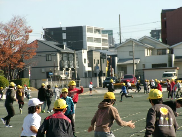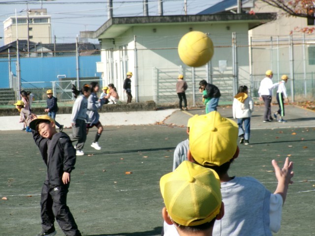 ボールで遊ぶ子、鉄棒をする子、鬼ごっこをする子・・・。他にも落ち葉を拾って秋を楽しむ子がいました。今日はぽかぽか陽気で、元気な声が運動場にこだましていました。