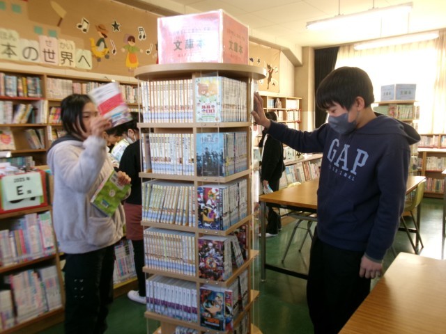 図書館に、新しい回転書架が2台届きました。寄付により購入していただきました。シリーズで並んでいるので、今まで以上に探しやすく、返す時も迷うことなく戻せるようになりました。