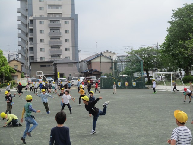 2時間目の避難訓練の前には雨がちらつきましたが、大放課の時には雨もあがり、運動場の状態もよかったため運動場で遊ぶことができました。