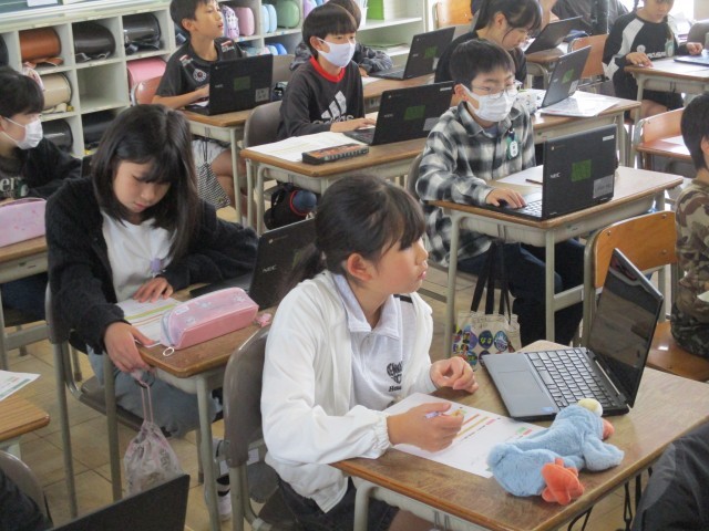 1年生の教室では長い放課に電子黒板で動画を見ていました。