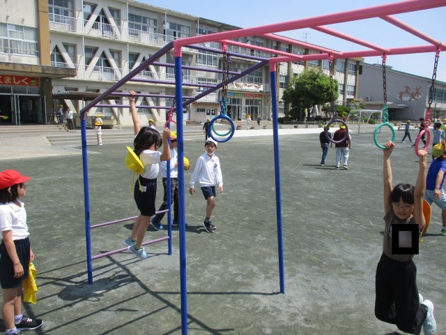 しばらく使用不可だった雲梯も新しく色が塗られ、たくさんの児童が遊んでいました。