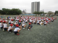 曇り空で涼しく、思い切り運動場で遊ぶことができます。多くの子どもと先生が運動場...
