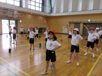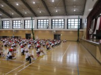 アリーナで、ソーラン節の振り付けの確認を3年生みんなで行いました。大きく動いた...