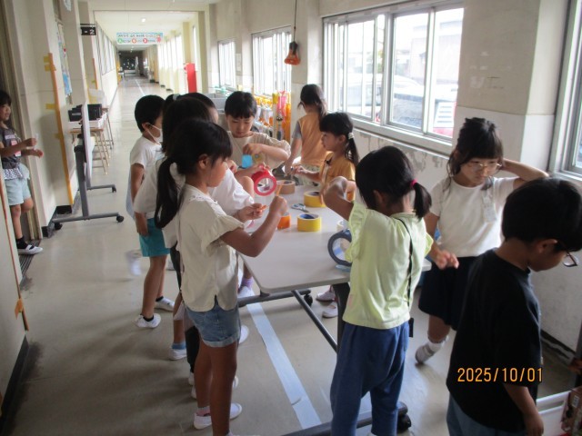 「先生 何に見える?」「ガムテープってすごい!グラグラしなくなった!!」「ペンギンつくってるの?うま~い!」と楽しそうにお互い見合いっこをしたり、試行錯誤したりして作品作りを楽しみました。