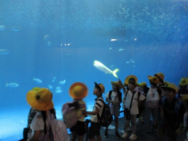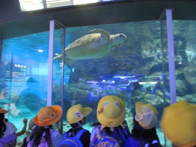 カレイやヒラメのかくれんぼ、ニモに登場する仲間たちがいる水槽、ハイギョなどの大きな魚をキラキラした目で眺めていました。