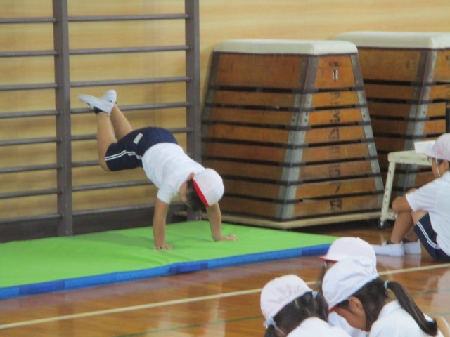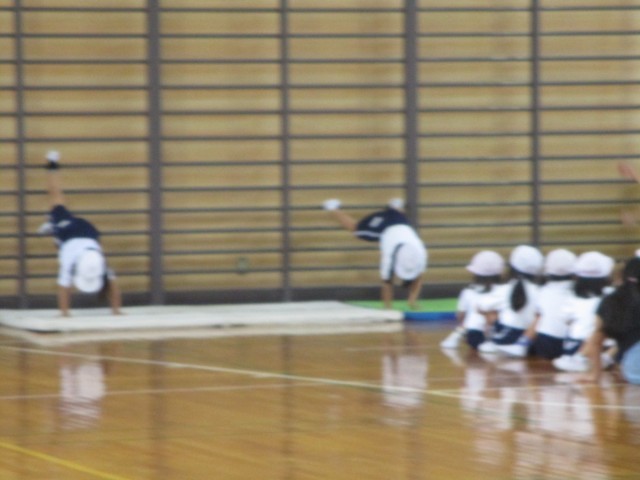 肋木に足をかけて、腕だけで横移動する運動を行いました。足と腕を使って上手に横行動していました。