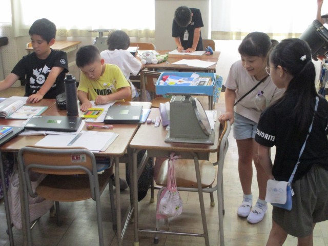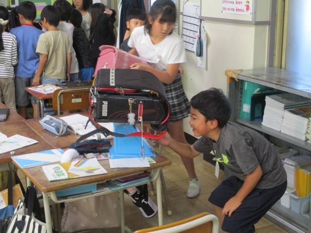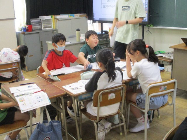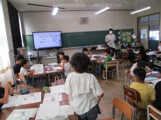 算数の時間、重さの学習をしています。今日は、教室内の身の回りにあるものをグループで出し合い、予想しながら実際に量りではかってみました。仲間と協力しながら楽しく学習していました。
