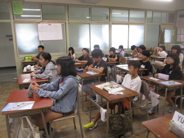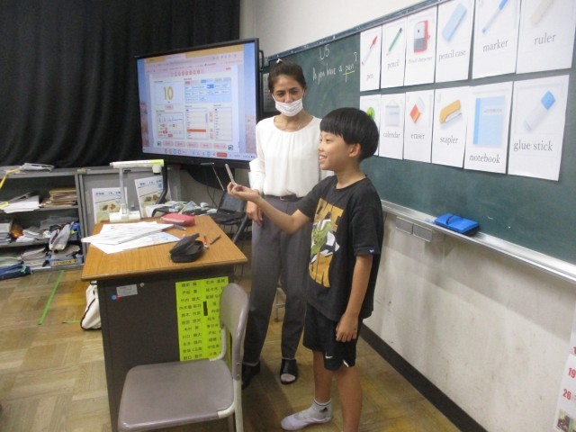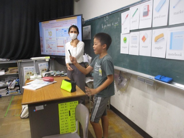 外国語活動の時間に文房具の言い方を習いました。先に言ってくれる仲間の後に続いて何度も繰り返しました。楽しく勉強できました。