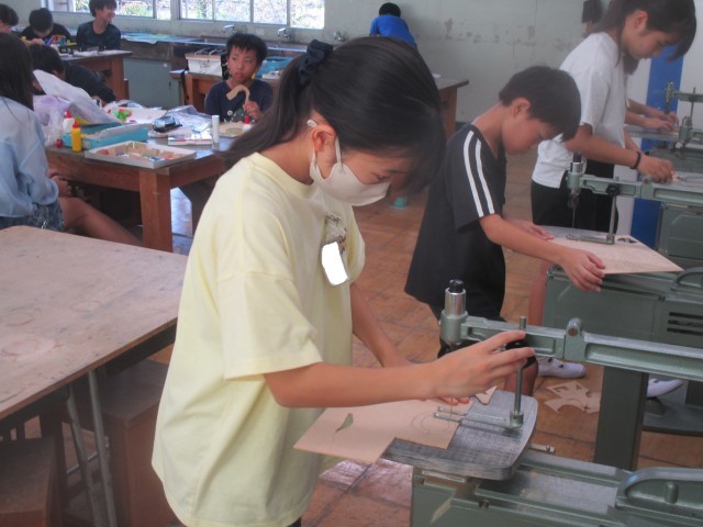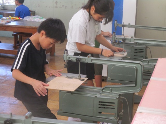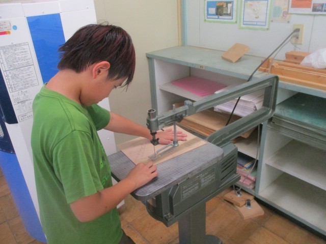 図工で糸のこを使って木の板を切っています。使い方もかなり上達してきました。