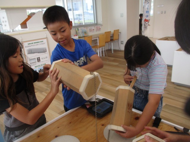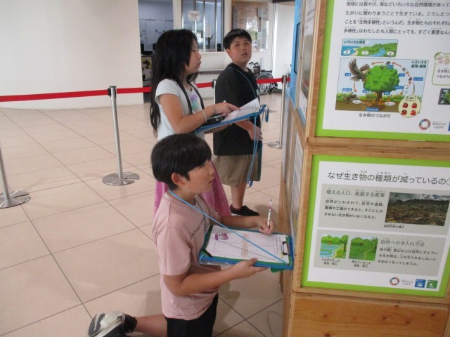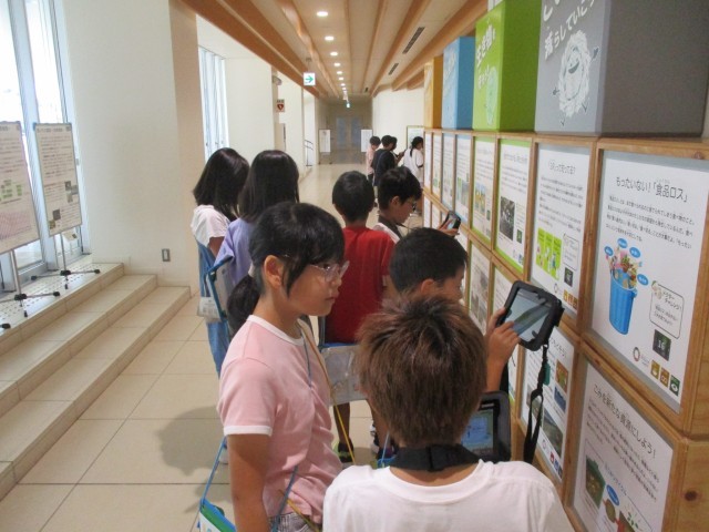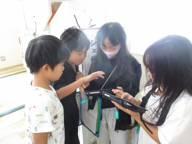 写真は、校外学習でタブレットで問題を解いたり展示の内容をメモを取っていたりする様子です。校外学習で環境について学んだことをもとにして、今週は同じテーマの人たちで集まってグループテーマを話し合って決めました。どの班も活発に意見を出し合っていました。