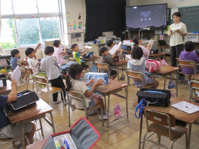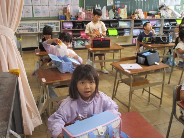 図工で、いよいよ絵の具を使う時期になりました。今日は絵の具セットの説明を聞き、使い方やしまい方などをしっかりと覚えました。