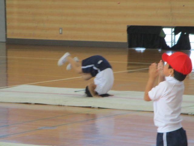 体育の時間です。マットを使って、丸太転がりや前転、後転などの技を組み合わせて演技しました。上手にできた子の演技を見て拍手を送っていました。