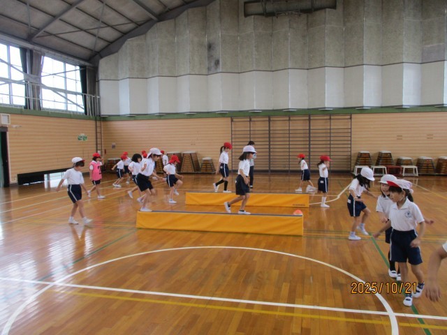 平均台を使って、バランスよく歩く運動をしました。体育館のフロアーに弾いてあるラインも利用して歩きました。