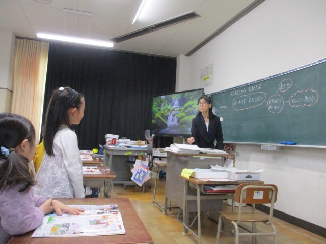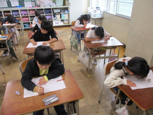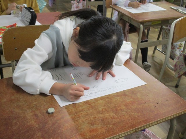 図工で、物語の絵「あいたくて たまらない」を描く前に、物語のタイトルから想像できることを考え、発表して膨らませました。そのあと、物語を読み、自分が想像するようすを下絵にしてみました。