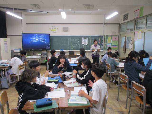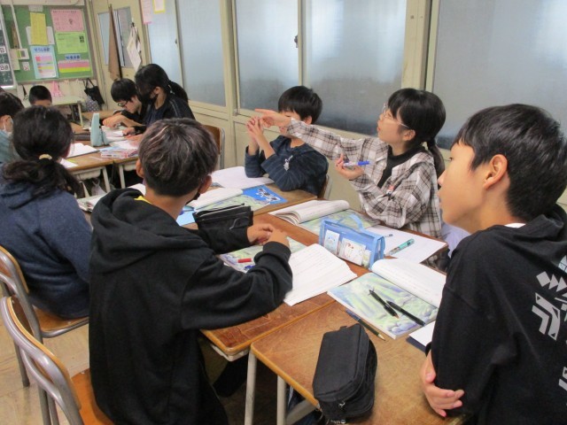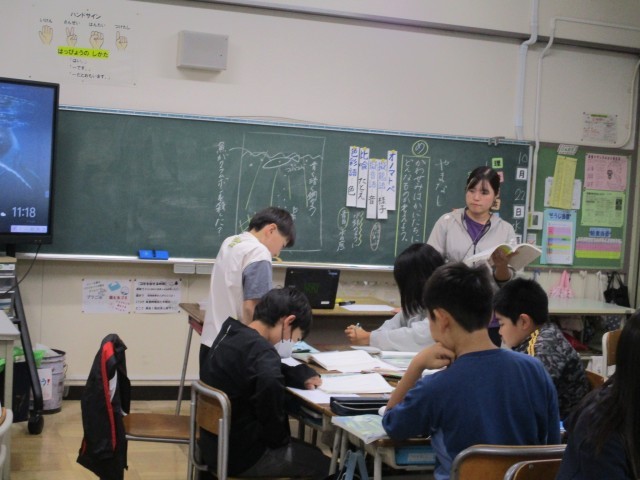 国語で宮沢賢治作「やまなし」を学習しています。グループで意見を交わした後、発表しました。