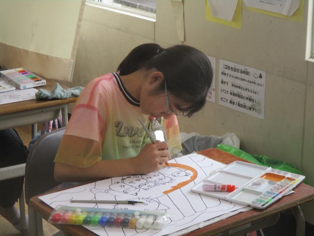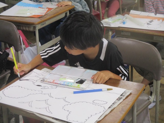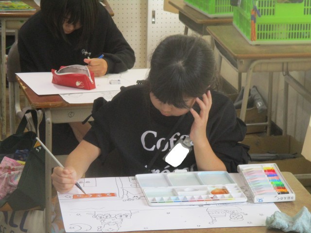 引き続き読書感想画を描いています。色塗りでは、2色の絵の具を混色して塗っています。混ぜ方を変えた時の色の違いにも気をつけながら描いています。
