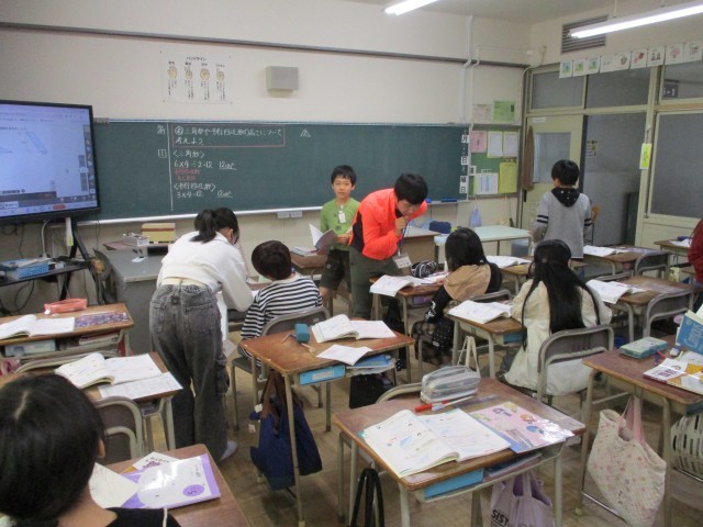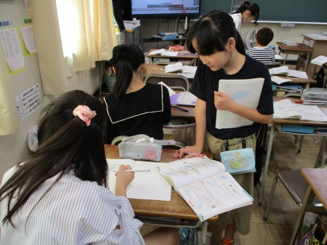 算数で、三角形の面積を求める問題に取り組みました。すべての子が理解でき、問題が解けるように、学び合う姿が見られました。