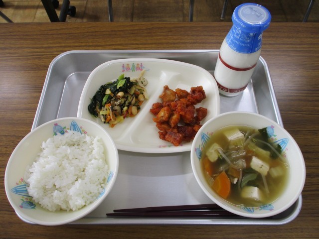 今日の給食は、ヤンニョムチキンが一番美味しかったです。味付けとってもおいしかったです。大きいおかずは野菜がたくさん入っていてとっても美味しかったです。明日も楽しみです。